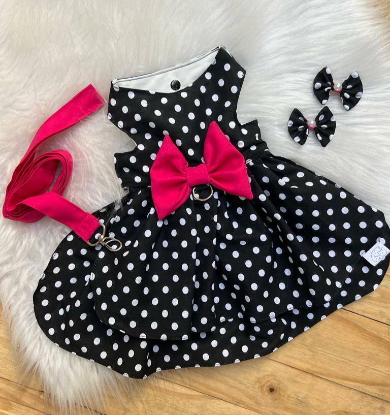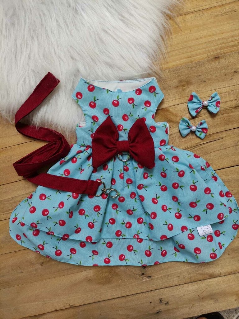 Vestido confeccionado em tricoline com laço central e Guia em tecido Oxford. Fechamento em botão de pressão. Vestido acompanha um par de laço e uma Guia, que mede cerca de 1.60 ficando com 1.40 com a volta para o apoio do braço.